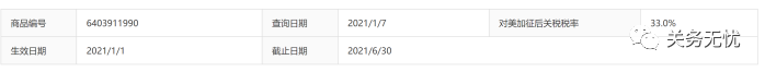 如上案例中,A公司進(jìn)口貨物為休閑皮鞋,申報(bào)商品編號(hào)為6403911990,該商品編碼項(xiàng)下的最惠國(guó)關(guān)稅率為8%,中國(guó)于2019年6月1日起對(duì)原產(chǎn)于美國(guó)該稅目下的商品實(shí)施加征25%的關(guān)稅。