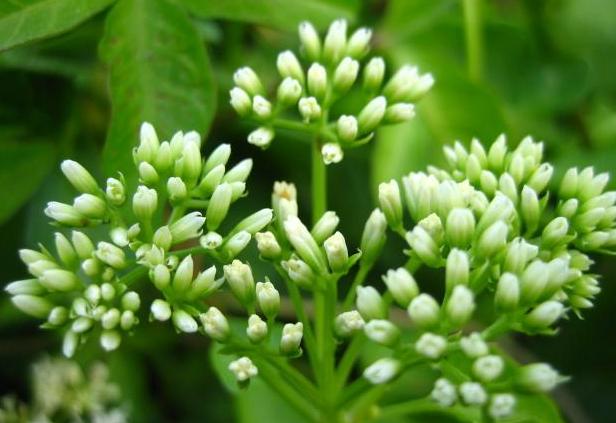 薇甘菊(Mikania micrantha Kunth in Humb.& al.):菊科、假澤蘭屬多年生草本植物或灌木狀攀援藤本,平滑至具多軟毛;莖圓柱狀,有時(shí)管狀,具棱;葉博,淡綠色,卵心形或戟形,漸尖,莖生葉大多箭形或戟形,具深凹刻,近全緣至粗波狀齒。圓錐花序頂生或側(cè)生,復(fù)花序聚傘狀分枝;頭狀花序小,花冠白色,喉部鐘狀,具長(zhǎng)小齒,彎曲;瘦果黑色,表面分散有粒狀突起物;冠毛鮮時(shí)白色。