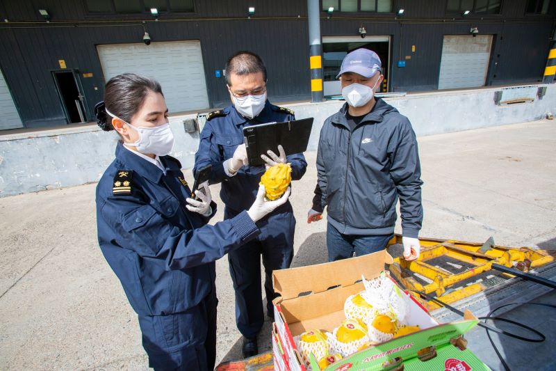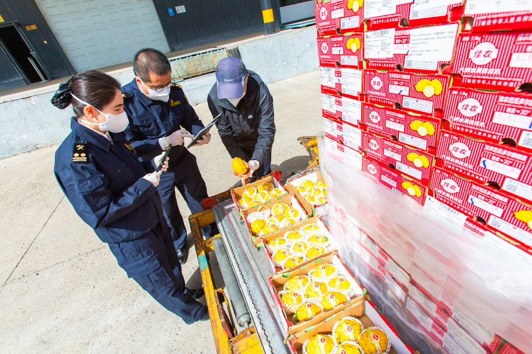 為做好這批“麒麟果”的檢疫通關(guān)工作,助力水果搶“鮮”上市,首都機(jī)場(chǎng)海關(guān)提前制定檢疫監(jiān)管方案,積極聯(lián)系對(duì)接地面代理企業(yè),及時(shí)追蹤航班抵港時(shí)間,確保“即到即查”。在海關(guān)監(jiān)管場(chǎng)地,現(xiàn)場(chǎng)關(guān)員快速核對(duì)輸華標(biāo)簽、植物檢疫證書等證單,并實(shí)行外觀檢查等檢疫措施,未發(fā)現(xiàn)有害生物,這批990公斤的水果被快速放行。