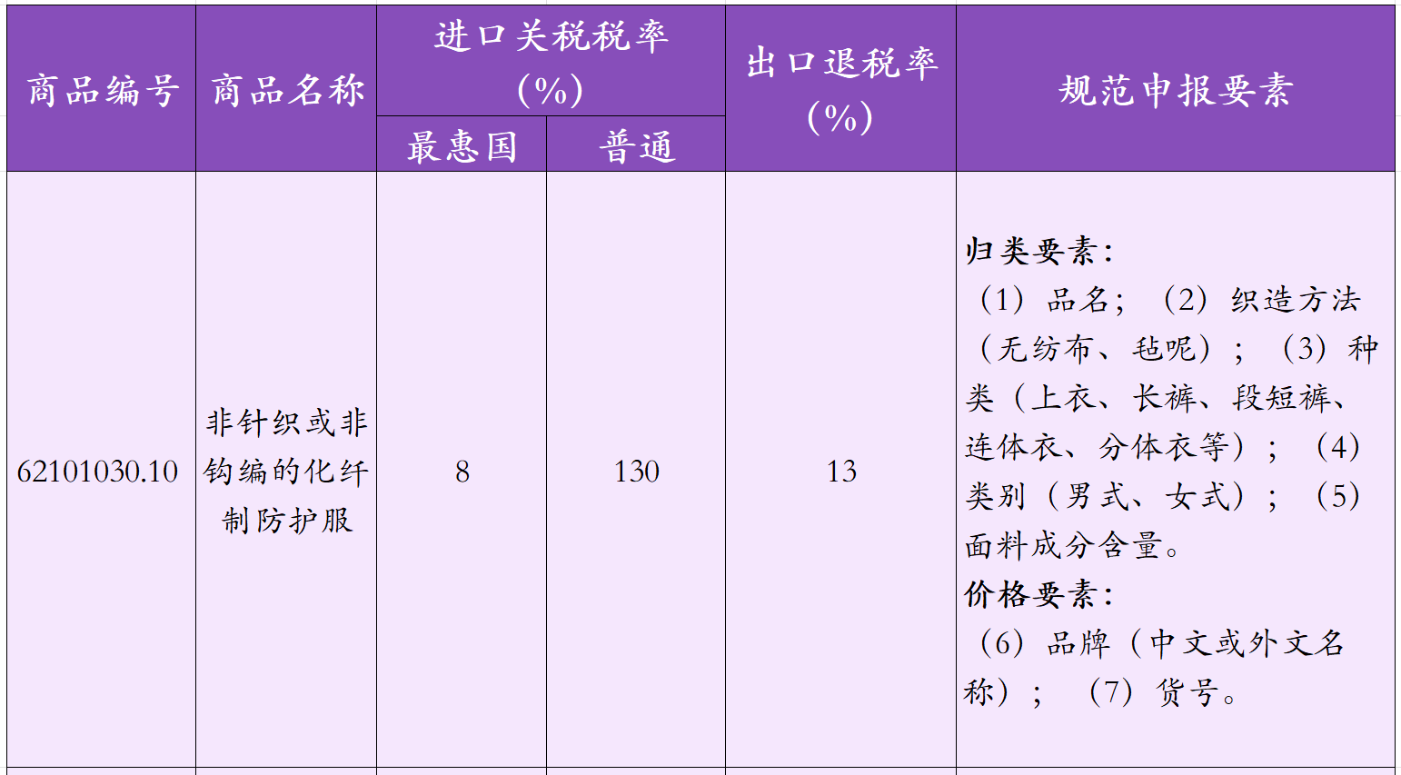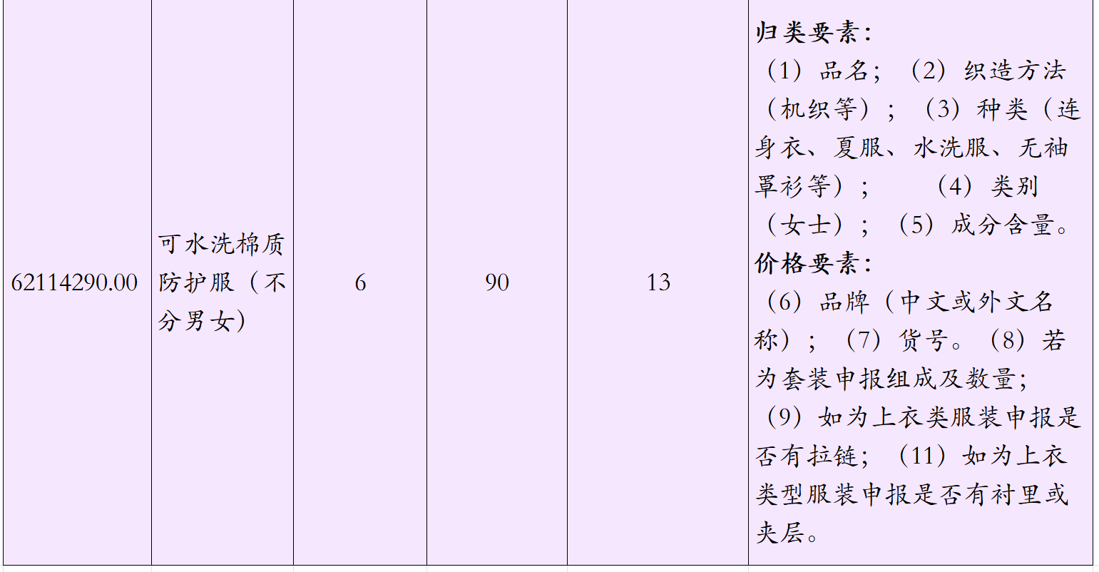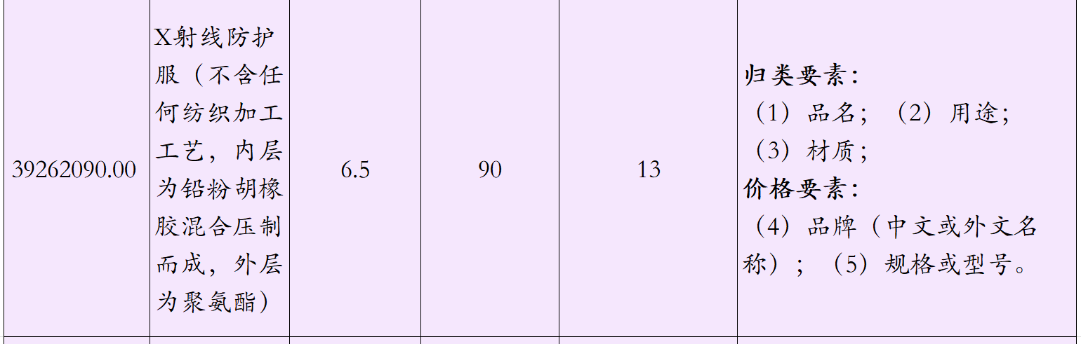 還有一些特殊的防護(hù)服,如醫(yī)院里放射性檢查工作人員穿著的X射線防護(hù)服,該防護(hù)服不含任何紡織加工工藝,分為內(nèi)層和包裹層兩部分組成,內(nèi)層為鉛粉和橡膠混合壓制成片,制成身體所需防護(hù)部位的樣式,內(nèi)層被聚氨酷片包裹,聚氨酷片構(gòu)成該商品塑料的基本特征這類防護(hù)服可以保護(hù)人體的骨髓及造血系統(tǒng)、生殖器官、甲狀腺和內(nèi)臟等重要器官,減少X射線對(duì)人體的損害。常見的防護(hù)服可能涉及的歸類及規(guī)范申報(bào)要素如下: