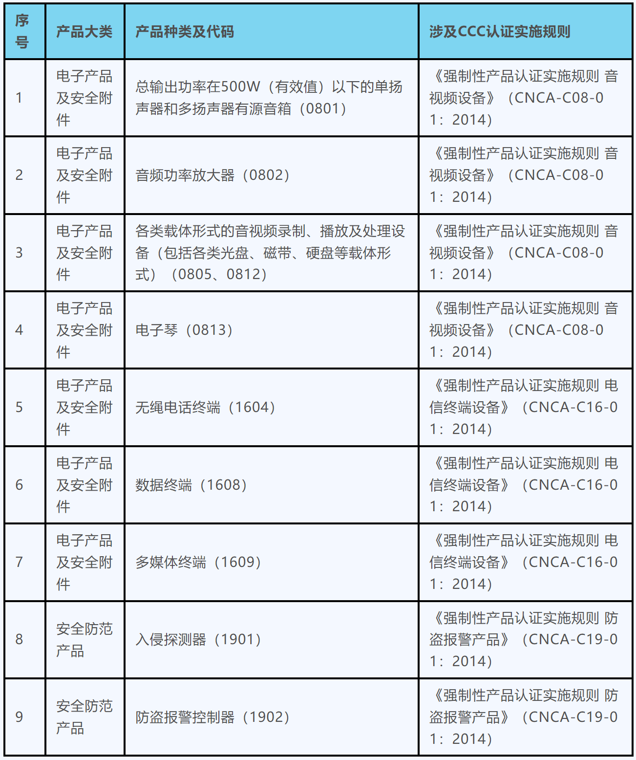 一、對安全風(fēng)險(xiǎn)較低、技術(shù)較為成熟的9種電子電器產(chǎn)品不再實(shí)行CCC認(rèn)證管理(見附件)。