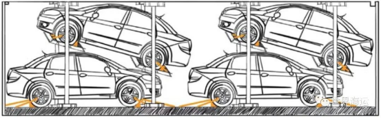 ( 2 ) 一箱三車:集裝箱內(nèi)放置一個(gè)運(yùn)輸支架,支架與箱體做好固定,一輛車斜向裝在運(yùn)輸支架上,一輛車平裝在支架下方,還有一輛車平裝于靠近箱門處。支架上的車輛通過綁扎帶與支架進(jìn)行固定,平裝車輛通過止移塊和綁扎帶與箱體進(jìn)行固定。