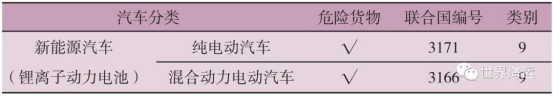 《國際海運(yùn)危險(xiǎn)貨物規(guī)則》特殊規(guī)定對(duì)車輛進(jìn)行了劃分,UN3171條目?jī)H適用于由濕電池組、鈉電池組、鋰金屬電池組或鋰離子電池組驅(qū)動(dòng)的車輛和在安裝電池運(yùn)輸情況下的由濕電池組或鈉電池組驅(qū)動(dòng)的設(shè)備。UN3166條目包括了在安裝電池運(yùn)輸?shù)那闆r下,以內(nèi)燃機(jī)和濕電池組、鈉電池組、鋰金屬電池組或鋰離子電池組共同提供動(dòng)力的混合動(dòng)力電動(dòng)車輛。